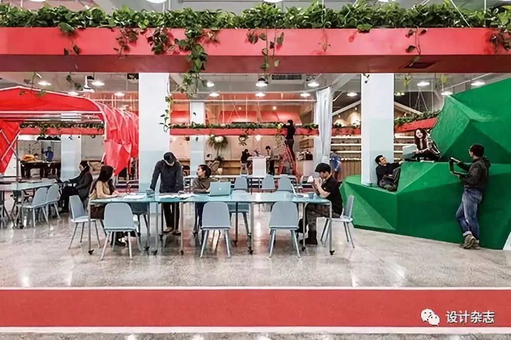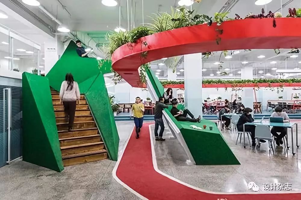 ●5个公司由一个中间悬挂的“红环”联系在一起,红环上种植蔬菜与植物,下面对应的是跑道。员工在跑道健步的同时可以打电话,也可以与照料植物的同事进行交谈。